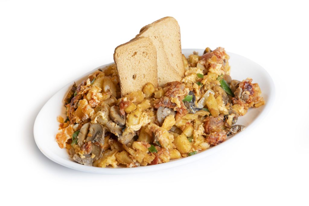 Revuelto de patatas, huevo, pimiento, cebolla, chorizo y champiñones.